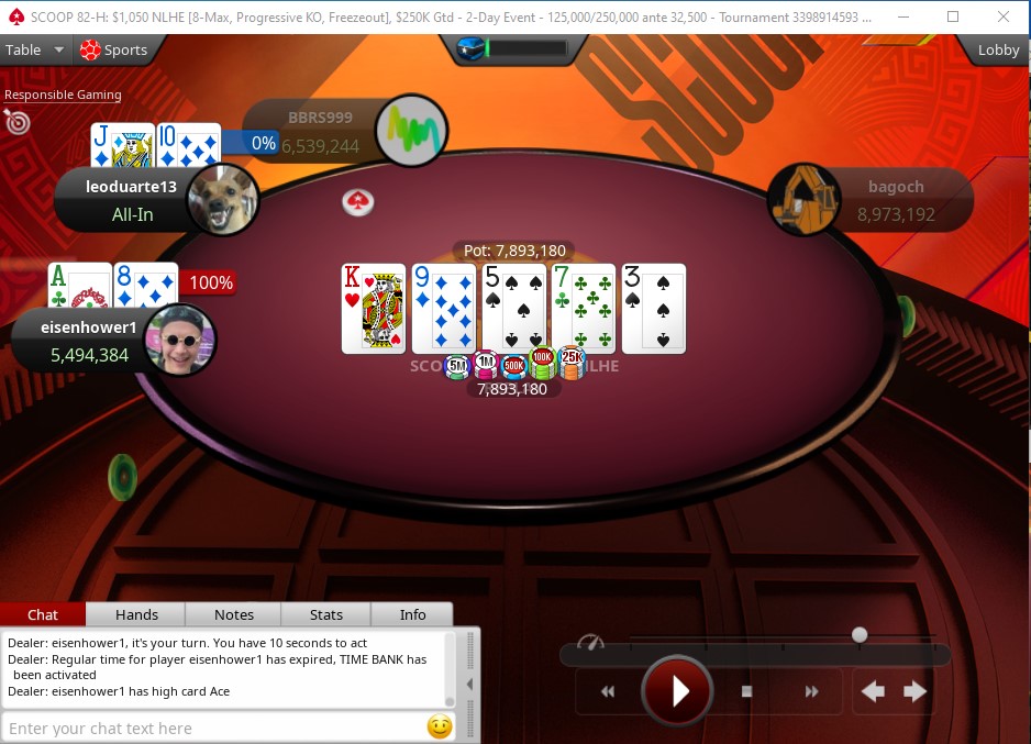 O jogo foi rolando até que o brasileiro acabou perdendo potes importantes, que o deixou short stack. Precisando se mexer, Leonardo deu um “fake all in” de JT no UTG e viu “eisenhower1” colocá-lo em risco. Ao pagar, Léo encontrou um showdown de A8, bem favorável, porém, o bordo K9573 decretou o fim da sua buca pelo bicampeonato.
