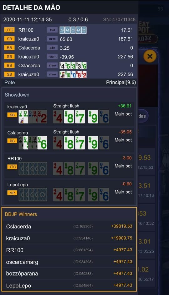 Entre suas cinco cartas, ele tinha e o board foi . Ele já estava seguido no flop, mas não contava é que o rival “kraicuza0” tinha e encontrou um straight flush maior já no turn. O bad beat jackpot foi ativado e rendeu uma forra sensacional para o perdedor de R$ 39.819, um valor insanamente maior do que o pote perdido.