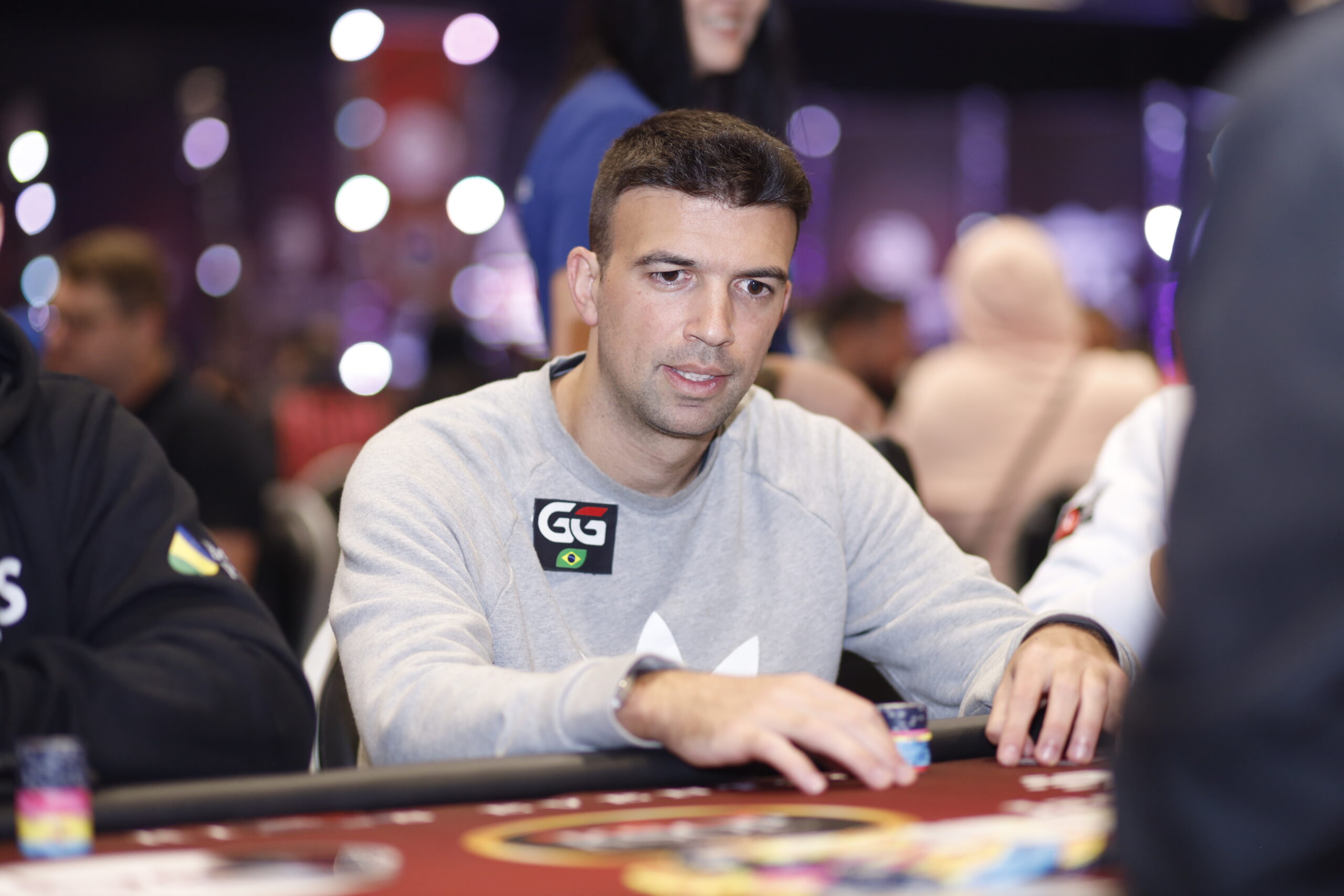 A jogada ocorreu nos blinds 2.500 / 5.000, “Droge1” anunciou all in de 55.765 fichas do botão, com . O jogador “Stiffler8818” resolveu ir all in com 95.590 fichas no small blind de . Com muita tranquilidade e cobrindo os dois adversários, Luiz pagou no big blind com seu .