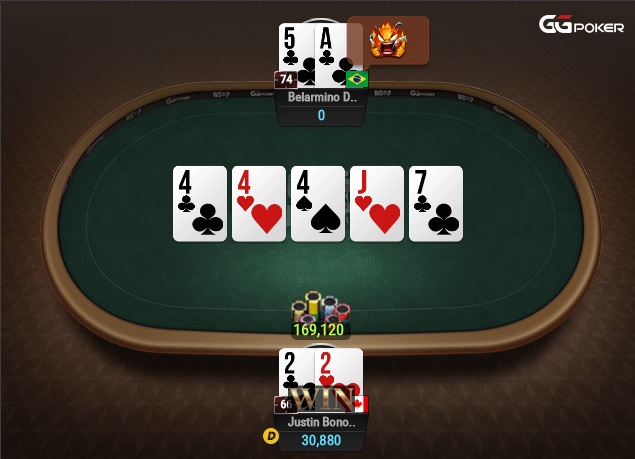 Bonomo abriu distância, mas Belarmino não queria ficar atrás. Em um potaço, o catarinense arrumou um full house com Q9 no board 4799Q e conseguiu extrair o máximo contra o AA do americano. Parecia que era o fim de Bonomo, que ficou com 40% do stack inicial. Mas a estrela dele brilhou. Pouco depois, conseguiu dobrar em all in pré-flop de A2 contra AJ de Belarmino. Um 2 surgiu no flop para atrapalhar o brasileiro.