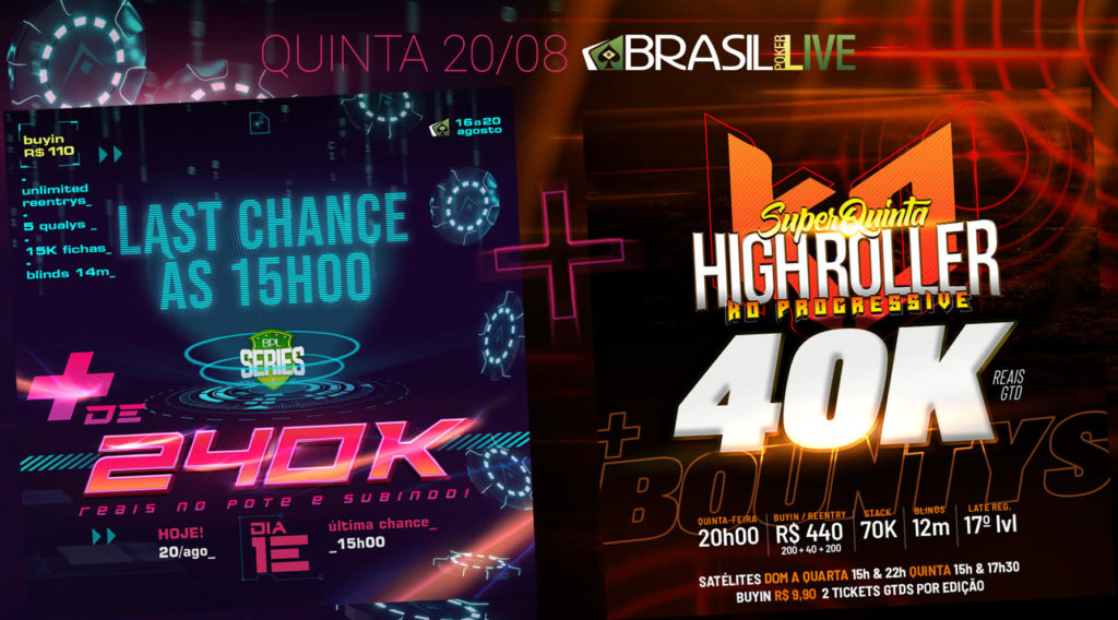Já às 20h, acontece o R$ 440 Super Quinta High Roller KO Progressive que tem R$ 40.000 garantidos. Na edição anterior, o torneio premiou R$ 116.400.