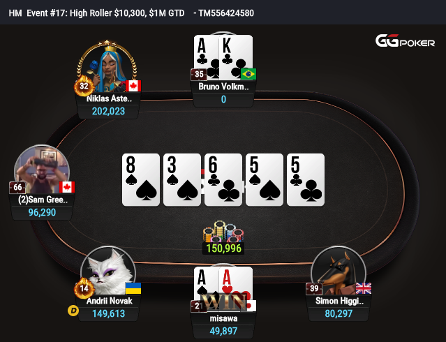 Bruno gastou alguns segundos do time bank e resolveu comprar na marra o pote. Ele foi all in de 47.387 fichas, pouco menos do que tinha o pote. O japonês não pensou tanto e trouxe a notícia ruim rapidamente. Ele pagou com e encerrou a trajetória de Volkmann no torneio de US$ 10.300.