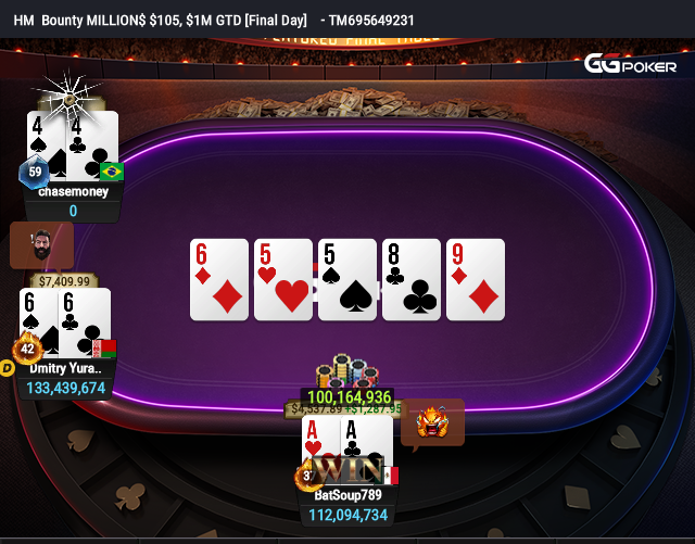 Foi um 44 que também encerrou a trajetória do “chasemoney”, mas desta vez estava na mão dele. Foi um all in contra novamente o jogador com a bandeirinha do México, que simplesmente acordou com AA no big blind após o shove do brasileiro. Yurasov ainda foldou a mão dele, um 66, e deve ter ficado amargo no board 65589 que decretou a queda de “chasemoney”.