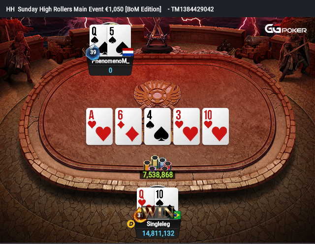 Aí o 3-handed acabou se extendendo um pouco. Pressionando bastante, o “Singleleg” conseguiu quebrar o AA do hondurenho “snowman2264” e eliminá-lo na terceira colocação. Já em grande vantagem, ele finalizou o torneio com QT contra Q5 de “PhenomenoM_” em um all in pré-flop no board A643T.