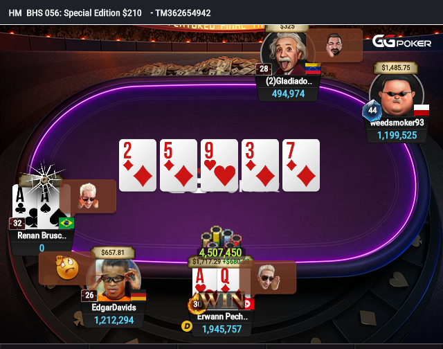 Tudo isso foi conversado enquanto Renan jogada a última telinha. E veio FT novamente, mas dessa vez uma bad beat impediu outra forra do gaúcho. Ele teve seu AA quebrado por Erwann Pecheux em pote de chip leader, sendo eliminado na 5ª colocação do Evento #56 da Bounty Hunter Series do GGPoker, levando mais US$ 6.422. O buy in do torneio era de US$ 210.