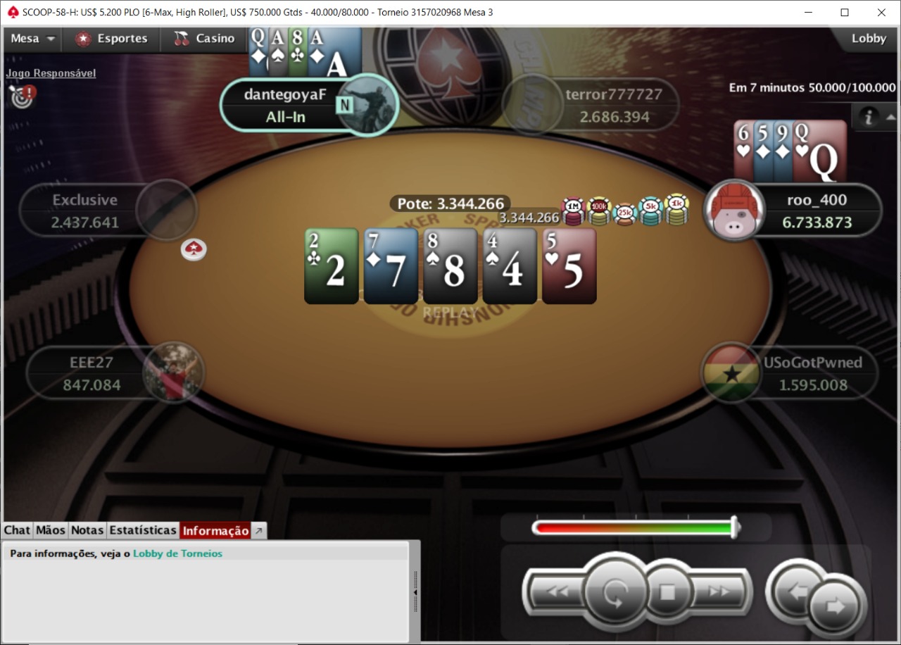 Apenas duas mão depois, “roo_400” novamente esteve envolvido em uma eliminação, dessa vez sendo o carrasco do representante da bandeira verde e amarela. Com pouco mais de 20 blinds, Dante 3-betou seu do small blind após raise do canadense, que era o chip leader, e tomou call do adversário.