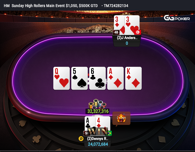 Dennys partiu para o heads-up contra o craque Joakim Andersson com uma boa vantagem, mas o sueco não foi presa fácil. O paulista precisou de certa paciência para não deixar o rival voltar a ter um stack confortável. No fim, um coin flip decidiu o torneio. Em all in pré-flop, Dennys tinha A4 contra 33 de Andersson e encontrou um A no turn para fazer a festa.