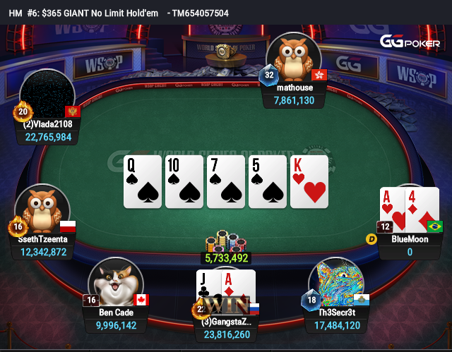 Os blinds foram subindo e o paulista ficou com apenas cinco blinds. Foi o momento que ele anunciou all in com A4 do botão, mas trombou novamente com seu carrasco “GangstaZab” no big blind com AJ. O board QT75K derrubou Campana do torneio.