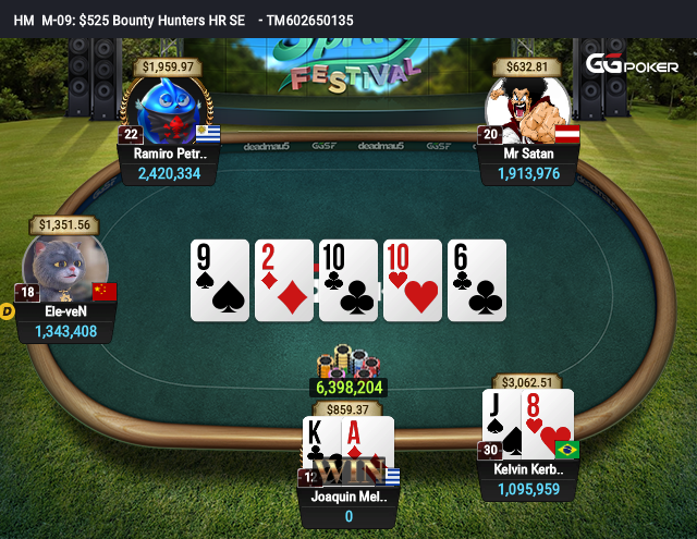 A reta final de um torneio de poker pode gerar muitas situações interessantes. A pressão pelo dinheiro e os pay jumps altos mudam demais o cenário. Em um dos bons eventos da GG Spring Festival, o #09-M (US$ 525 Bounty Hunters HR SE), uma jogada do craque Kelvin Kerber chamou bastante atenção.
