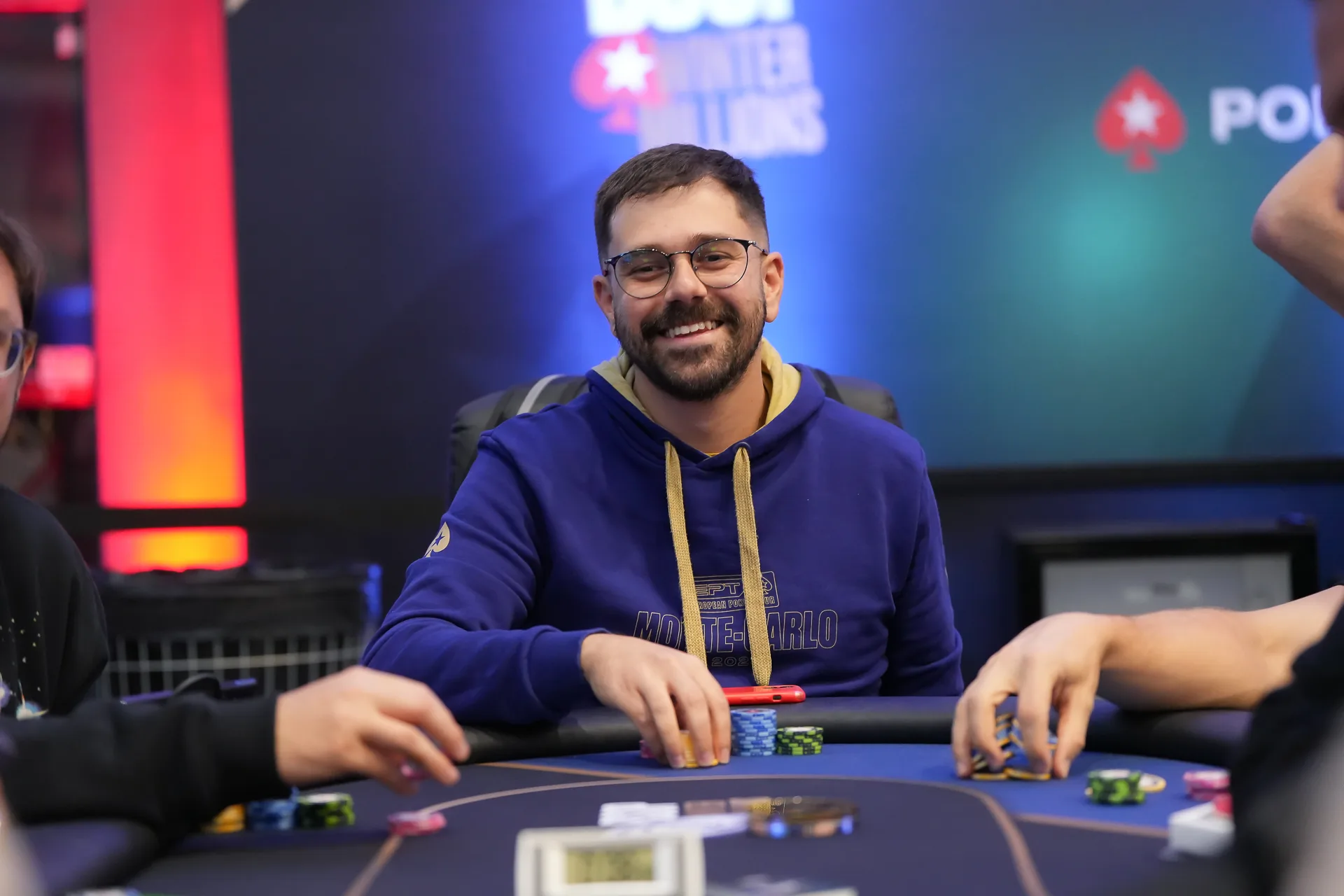 O fold do button foi instantâneo, mas Dejan Kaladurdjevic decidiu gastar alguns poucos segundos em sua decisão no small blind. E foi aí que um segundo foi extremamente precioso: no exato momento anterior ao fold do montenegrino, Neymar retornou para a mesa. E sem pensar muito, ele optou por shovar em cima de Astedt. O sueco, claro, foldou.