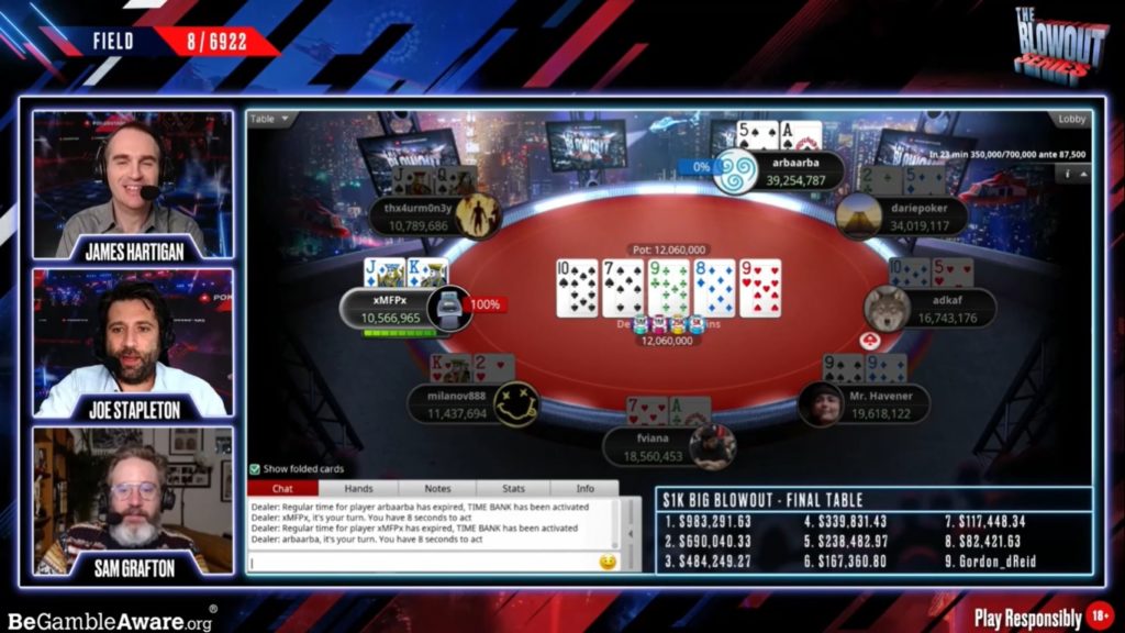 Durante a mesa final, Eike jogou alguns spots complicados e um deles acabou se tornando uma mão interessante. Nos blinds 300.000 / 600.000, a ação começou com raise de “xMPFx” do UTG+1 de 1.200.000 com . O lituano “arbaarba”, como bom chip leader, colocou pressão e 3-betou de MP com para 3.180.000.
