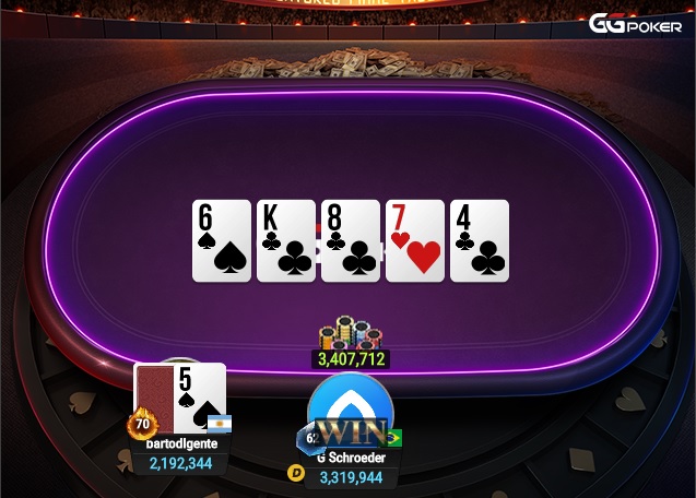 Gabriel deu raise para 200.000 e Julio aumentou para 456.789. O jogador do 4bet Team pagou. O flop trouxe . O argentino c-betou 234.567 fichas e o brasuca pagou. O turn veio e Julio apostou o segundo barril para 456.789, mas levou raise de Gabriel para 1.000.000 e deu o call. Assim, o river trouxe . Gabriel foi all in de 3.319.944 e o argentino foldou.