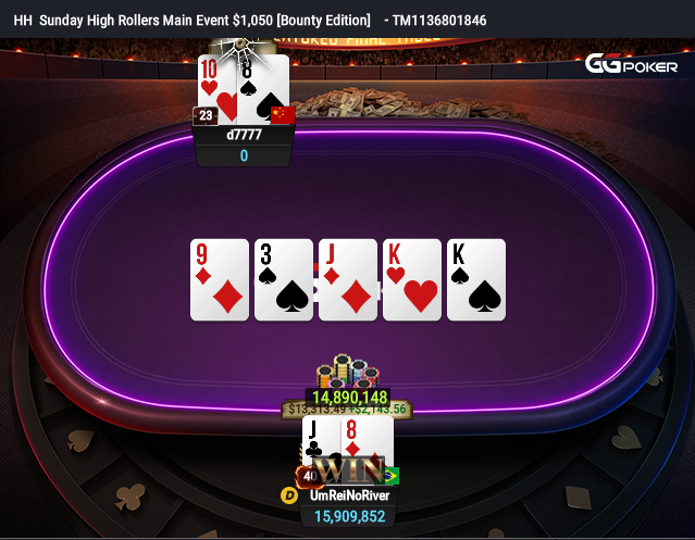 Dominando a decisão e eliminando os oponentes, Geraldo despachou Eduardo Pires em um all in pré-flop. Seu JJ não deu chances ao K6 do compatriota no board A9TT4. O heads-up contra o chinês “d7777” durou pouco.