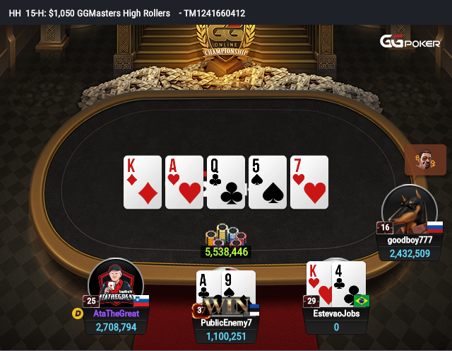 Após o turn 5, onde ambos foram de check-check, Luigi e “PublicEnemy7” viram o river 7. O brasileiro não tinha posição e, quando o oponente apostou 528.000 fichas, ele optou por shovar suas 1.969.223 com o segundo par da mesa. O estoniano deu call de A9 e com o top pair eliminou Luigi do torneio.