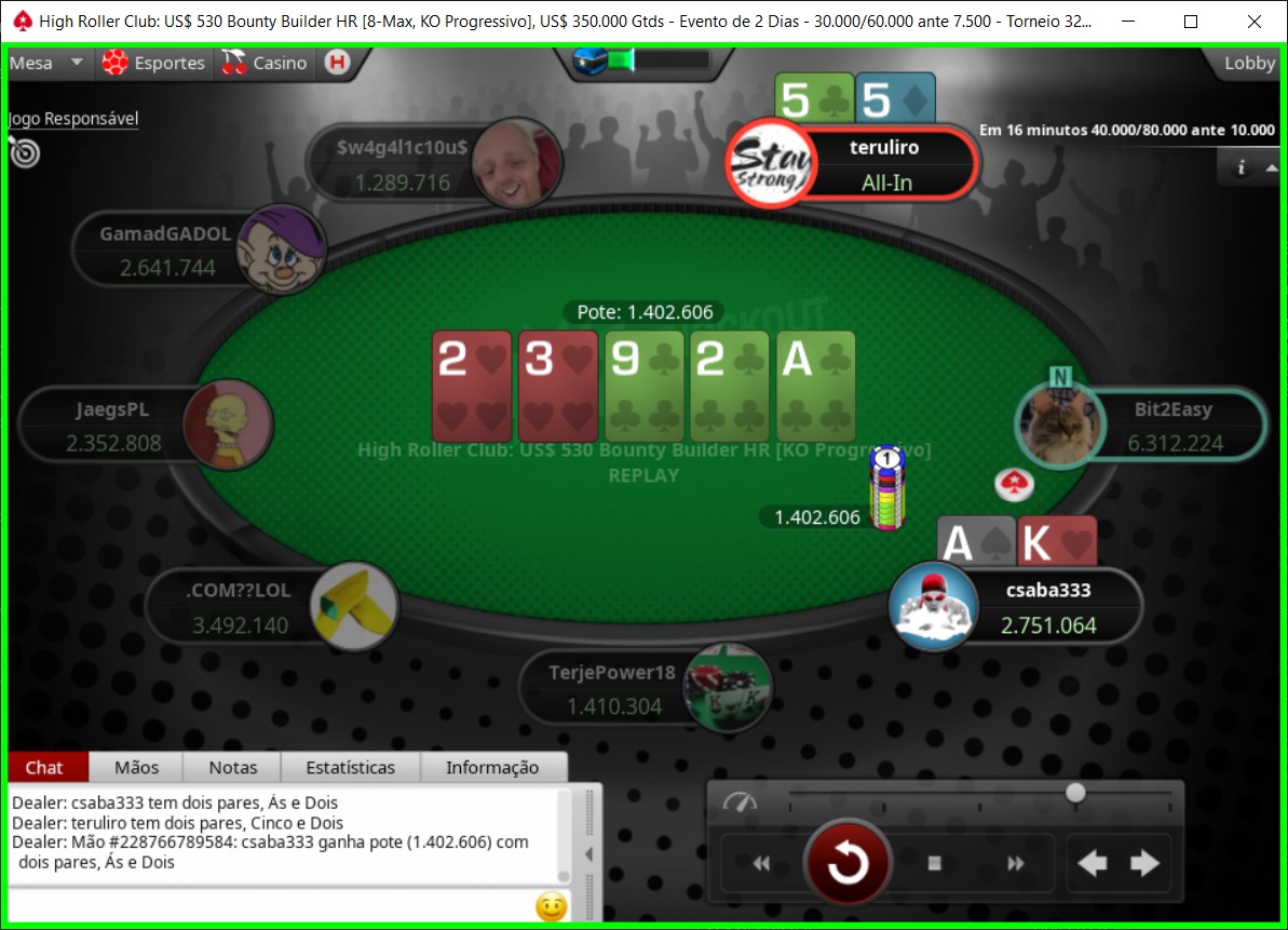 Com 55, ele deu all in e foi pago pelo player “csaba333”. Tudo ia bem até o turn, mas o river do board 2392A decretou a queda do “teruliro” na oitava colocação, encerrando a participação brasileira na mesa final.