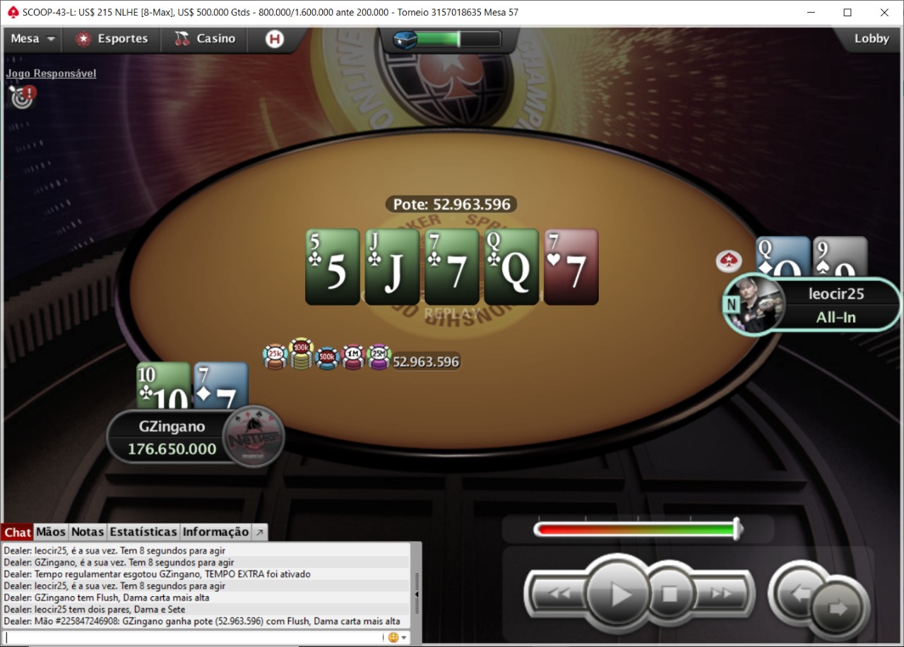 Depois de assumir a liderança, Guilherme não deu mais espaços para o adversário e foi minando o stack de Leocir, levando a maioria dos potes disputados. Sem saída, o torneio culminou com uma mão interessante. “leocir25” acertou seu top pair no turn, mas o board continha quatro cartas de paus. Mesmo assim, ele decidiu pagar a aposta de Zingano no river e viu que a decisão havia sido derradeira, já que o oponente tinha o flush.