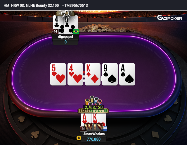 O Brasil quase comemorou o primeiro título da High Rollers Week do GGPoker. Rodrigo Semeghini “digopapel” parou em um heads-up de respeito contra Fabrizio González e puxou US$ 85.364. O uruguaio, comandando a conta “UKnowWhoIam”, é conhecido pelo nick “SixthSenSe19” e é considerado um dos melhores jogadores do mundo. Ele faturou US$ 92.936.