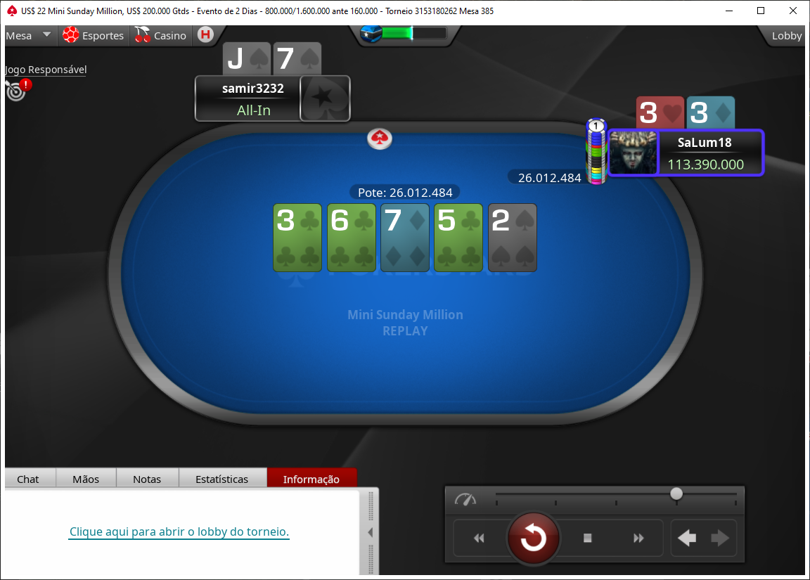 Na mão decisiva da competição, Lucas Salum e seu rival “Samir3232” se envolveram em all-in pré-flop e o brasileiro ganhou o flip quando seu superou o no board . A vitória na jogada trouxe o título para o brasileiro, que terá bons motivos para comemorar a segunda-feira.