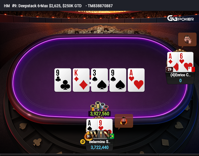 Quando sobraram apenas 10 blinds para o rival, Belarmino foi all in com A9 e tomou call de A6. O board 9K39A veio para matar o confronto com classe para o brasileiro. Enrico ficou com US$ 69.684 pelo vice.