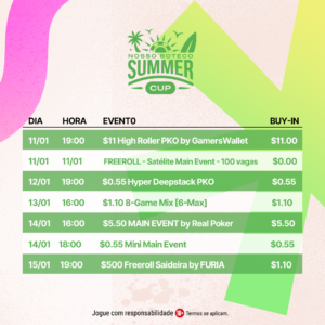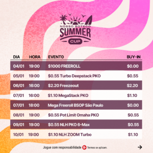 A Summer Cup 2024 distribuirá mais de R$ 80 mil em premiação e possui buy-in médio de apenas US$ 1,85. No total, serão 15 torneios, sendo quatro Freerolls, além de diversos prêmios exclusivos que serão reservados aos cinco melhores do ranking do evento.