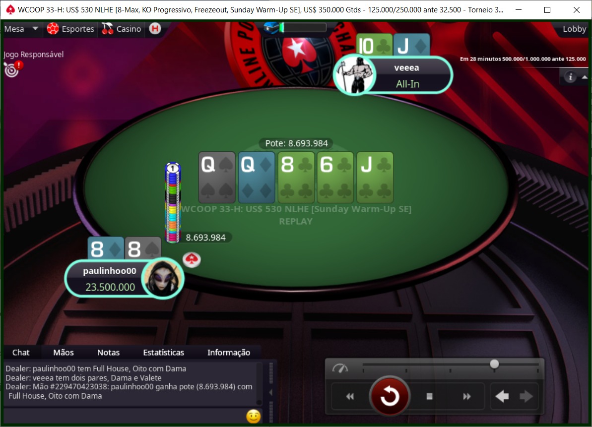 O brasileiro deu uma aula no HU, assumiu a liderança em pouco tempo e foi minando o stack do adversário até conseguir abrir uma distância considerável. Ele foi reduzindo as fichas do oponente e na mão final contou com um bom board para garantir a vitória. Ele segurava 88 e viu a mesa mostrar QQ86J para colocar o “veeea” na porta no river. O rival pagou com JT e decretou a vitória de Brombim no torneio.