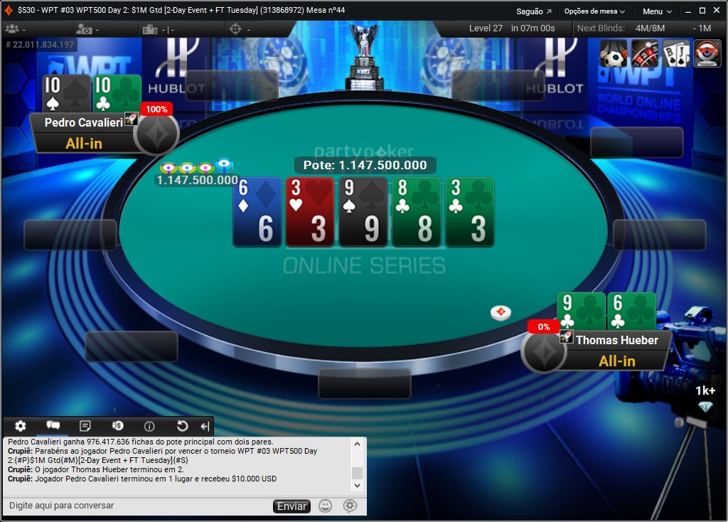 Bernardo era o short quando se iniciou e acabou se despedindo em uma mão sem escape. Ele shovou AQ e trombou com AK do austríaco Thomas Hueber, deixando a chance de glória para o amigo do 4bet. Pedro tinha vantagem no HU e acertou um acordo onde levava a maior parte da premiação. Eles continuaram jogando pela glória e por US$ 10 mil, e Pedro passou o carro em pouco tempo.
