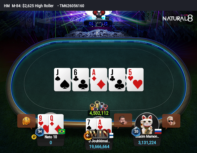 Jouhkimainen começou a pressionar praticamente indo all in em todas as mãos com os stacks de Padilha e Mamonov sangrando na UTI. O pay jump de 3º para 2º era alto: US$ 26.263 a diferença. Eles até dobraram uma vez cada para continuarem vivos. Numa das tentativas para somar fichas, Padilha foi all in com Q9 e encontrou Joni com A7. Desta vez não teve jeito e sacramentou a queda do brasileiro.