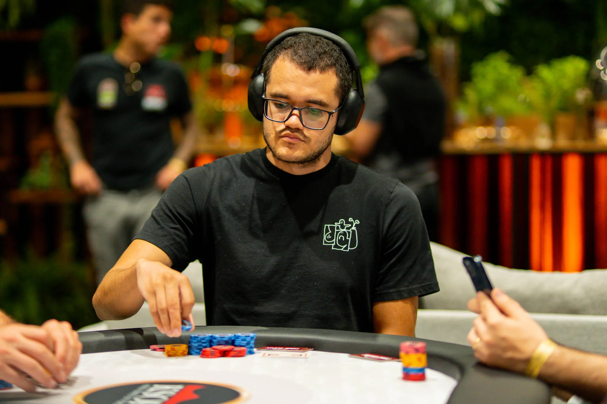 Carlos Serrano, o “Crumbs”, foi quem teve a má notícia no salão do Expocentro. O jogador colombiano acabou eliminado num embate pré-flop contra Kaio Camargo, o “Kaiotex”, depois de começar o dia com um dos menores stacks ainda vivos na competição.
