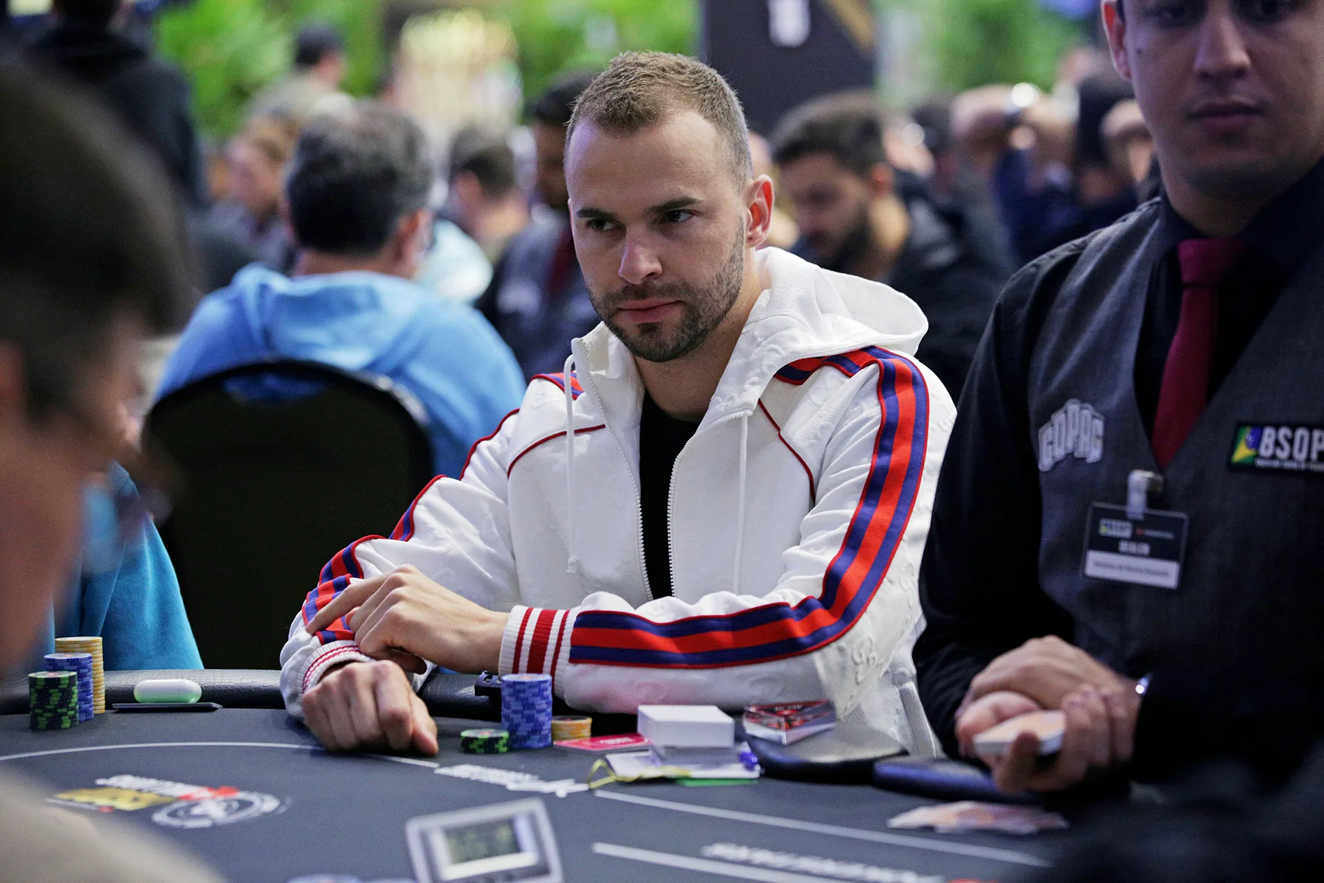O fold do button foi instantâneo, mas Dejan Kaladurdjevic decidiu gastar alguns poucos segundos em sua decisão no small blind. E foi aí que um segundo foi extremamente precioso: no exato momento anterior ao fold do montenegrino, Neymar retornou para a mesa. E sem pensar muito, ele optou por shovar em cima de Astedt. O sueco, claro, foldou.