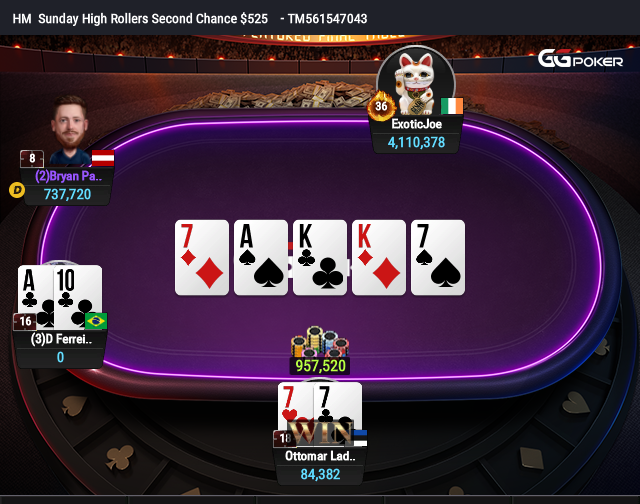 Com o jogador “ExoticJoe” disparado na ponta, Douglas lutava para sobreviver contra Ottomar Ladva e Bryan Paris. Quem eliminou o brasileiro foi o jogador esloveno, campeão do Super High Roller do MILLIONS Online recentemente. Ladva tinha 77 no flip contra AT de Douglas e o board A7KK7 foi cruel com o pernambucano.
