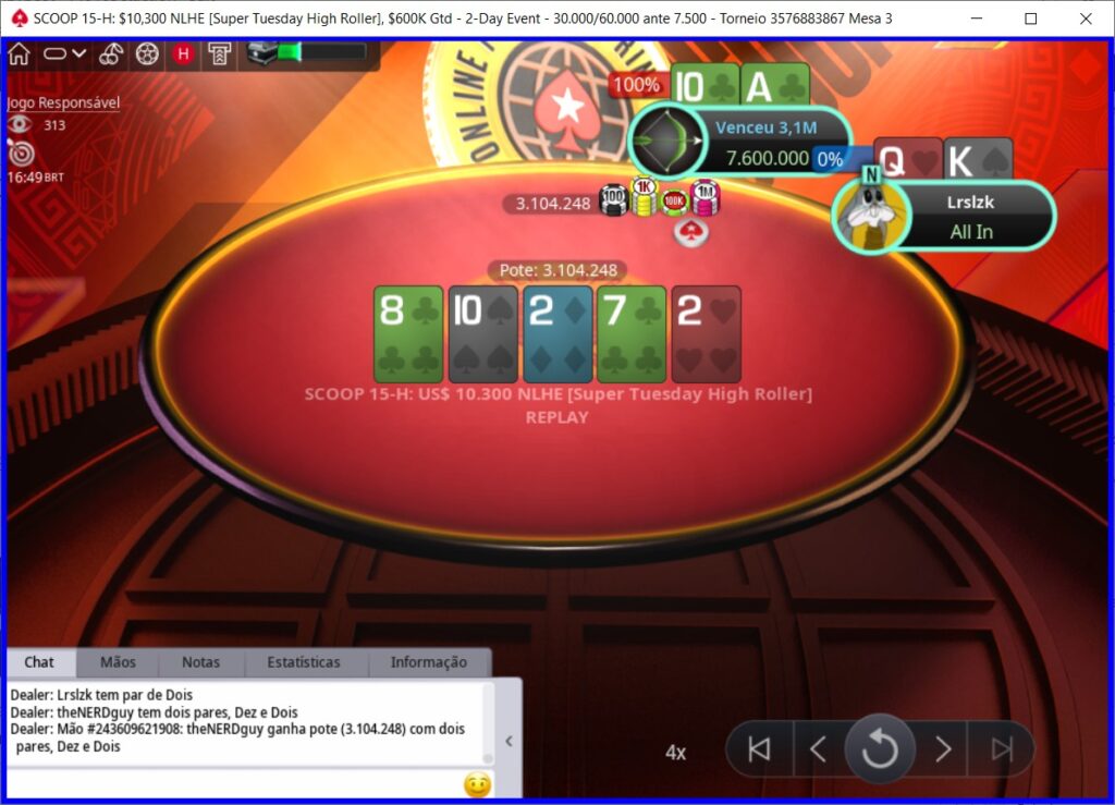 Rapidamente, Yuri ganhou alguns potes jogados e viu seu stack crescer aos poucos. Mantendo o ritmo forte contra os rivais, ele rapidamente equilibrou os stacks e em questão de mais alguns minutos, já tinha assumido a liderança com um desempenho arrasador. Com o jogo “nas mãos”, ele seguiu atormentando os rivais e em um all in pré-flop, eliminou “PAX172”.