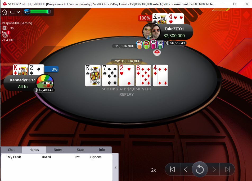 A jogada derradeira aconteceu após uma ação no board K7284, onde os jogadores acabaram indo all in no river. Melhor para Thomas Garcia, que tinha K4 e viu seu adversário “KennedyPK97” apresentar K2, um cooler de dois pares.