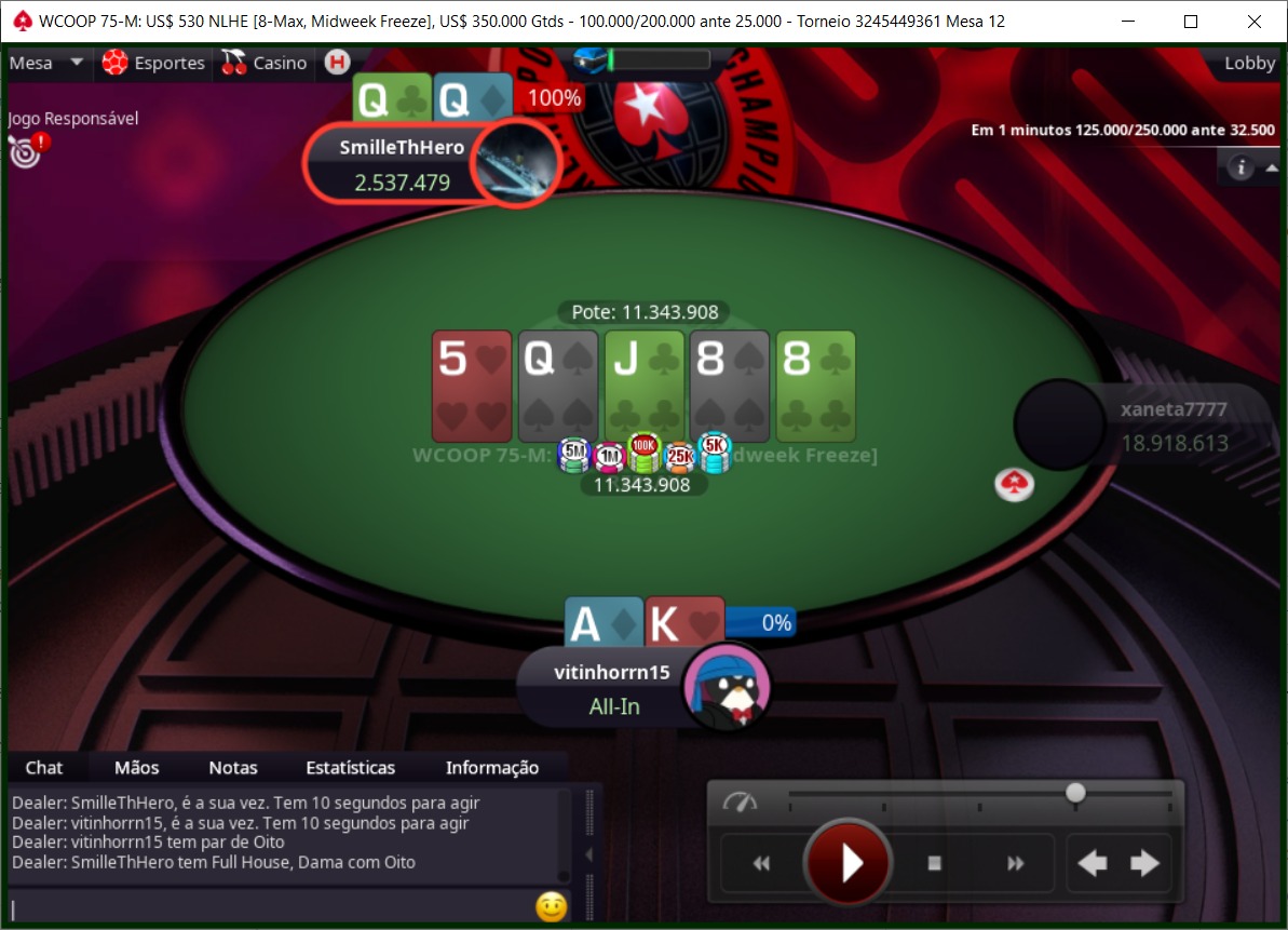 Por fim, o último destaque do boletim no PokerStars foi anotado no US$ 109 Super Tuesday, que contou com 223 registros, em quase sete horas de jogo. João Mathias, o “joaoMathias”, superou seus rivais e foi mais um a ser o grande campeão, adicionando US$ 4.379 ao seu bankroll.