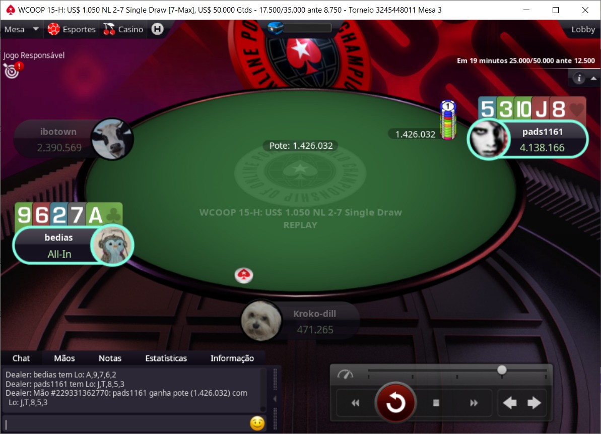 O jogo ficou bastate equilibrado, apenas com o “pads1161” um pouco mais confortável na frente. Depois de alguns bons minutos, o “bedias” foi ficando curto, próximo do último lugar e foi para o tudo ou nada. Ele foi pago pelo “pads1161” e acabou eliminado da disputa com a quarta colocação. Bernardo formou seu jogo com A9762, enquanto Leonard fez JT853.