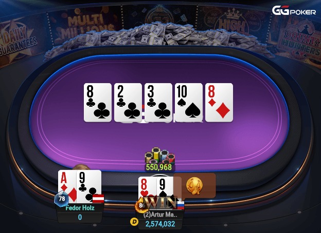 A mão decisiva do heads-up aconteceu com o alemão já short stack. Os dois foram em all in pré flop com o russo segurando dominado pelo de Fedor Holz. Porém, logo no flop um acertou o out de Martirosyan, mas deu um flush draw para o adversário. O turn foi um e o river um , confirmando o título do russo.