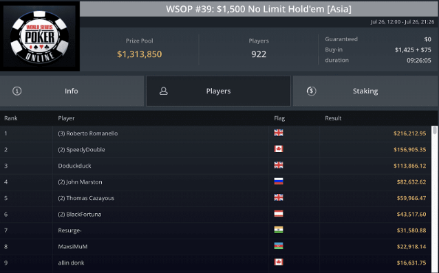 Foram quase nove horas de batalha para chegarmos ao campeão de um field com 922 entradas no Evento #39 US$ 1.500 No Limit Hold’em. Vencer esse evento não foi uma tarefa fácil para o britânico Roberto Romanello pois ele enfrentou o lendário Niklas Astedt na batalha do heads-up pela maior fatia da premiação total de US$ 1.313.850.