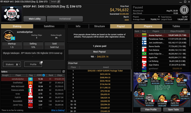 Apenas 1.946 jogadores de um total de 12.757 entradas chegaram ao dia 2 do Evento #41 US$ 400 COLOSSUS, que premiou as primeiras 1.575 colocações com a primeira faixa pagando US$840.86. Grandes nomes como Mike McDonald, Thomas Boivin, Joao Vieira, Chance Kornuth, Mark Radoja e Steven van Zadelhoff tiveram desempenhos muito bons. O austríaco Matthias Eibinger ficou em 14° lugar.