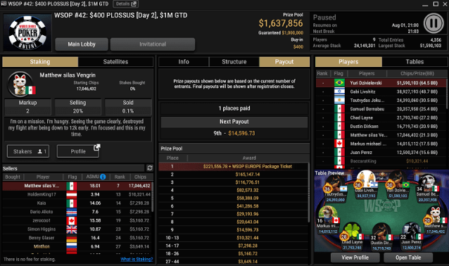 O brasileiro que já tem um bracelete WSOP, Yuri Dzivielevski, lidera a mesa final do torneio, à frente de Gaby Livshitz, de Israel. Outros finalistas famosos são Samuel Bernabeu, Chad Layne, Dustin Dirksen e Matt Vengrin. Eles já garantiram um prêmio de US$ 14.596,73 até então mas o vencedor levará US$ 221.556,78 em dinheiro junto com o pacote de US$15.000 para o Main Event da WSOP Europe.