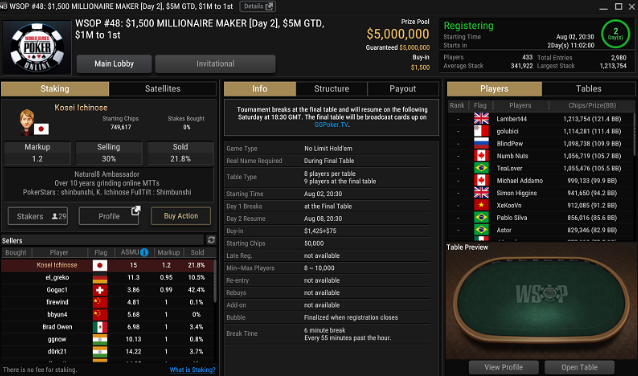Além disso, os sobreviventes dos dias iniciais do Evento #48 US$ 1.500 Millionaire Maker competirão pelo prêmio principal de US$1 milhão. Até agora, 433 jogadores das 2.981 entradas totais já garantiram seus assentos no dia final. Esse evento oferece uma premiação garantida de US$ 5 milhões e ainda restam alguns dias iniciais.