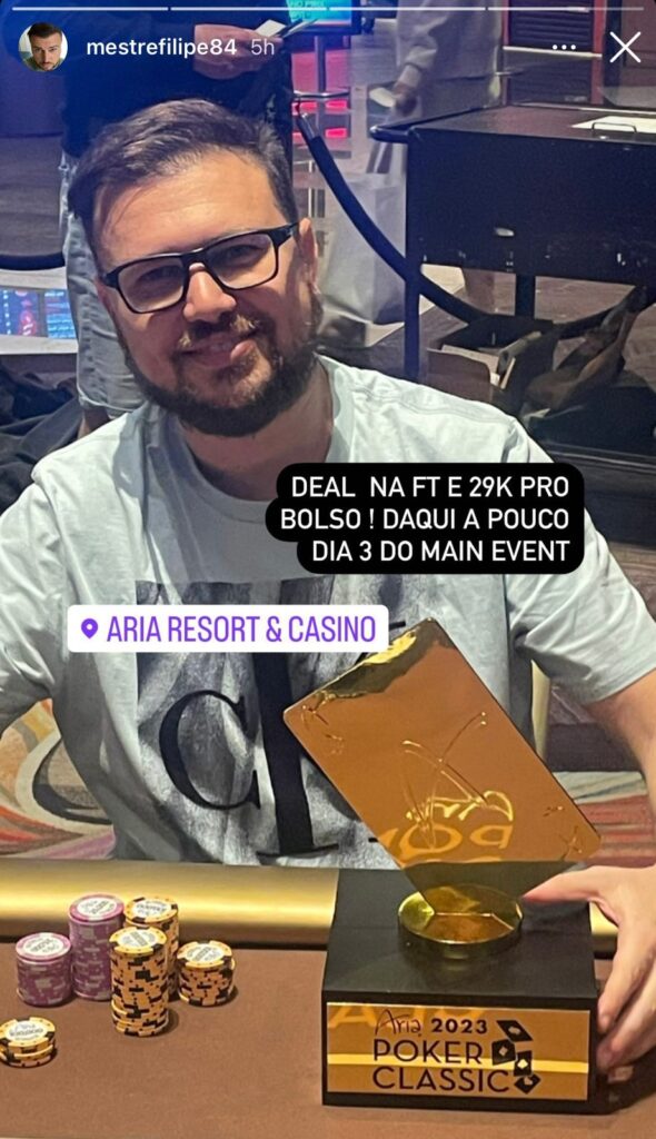 Muitos aproveitam essas pausas para descansar, ou até para curtir uma festa e um restaurante em Las Vegas, mas no caso de Mestre Filipe, a opção foi jogar mais poker. O paranaense fez acordo no 3-handed do US$ 600 NLH do Aria Poker Classic e puxou US$ 29.000.