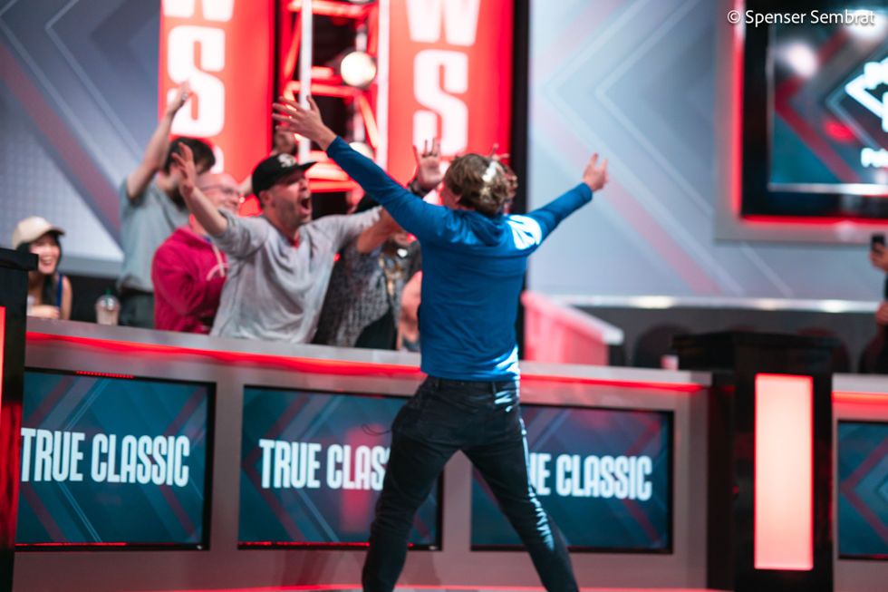 Para deixar tudo ainda mais especial, o jogador quebrou um par de reis na mão final. A ação começou no flop e terminou em all in, com Marius segurando contra . O lituano encontrou uma trinca no turn e confirmou o título após o river .