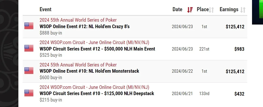 O americano Joshua Remitio poderia virar matéria por dois títulos quase consecutivos em uma coincidência incrível. No site da WSOP, ele aparecia como campeão do Evento #10 Online US$ 600 No-Limit Hold’em Monsterstack e do Evento #12, também online, o US$ 888 No-Limit Hold’em Crazy 8’s. A curiosidade maior é que, nos dois, ele teria levado o mesmo prêmio: US$ 125.412