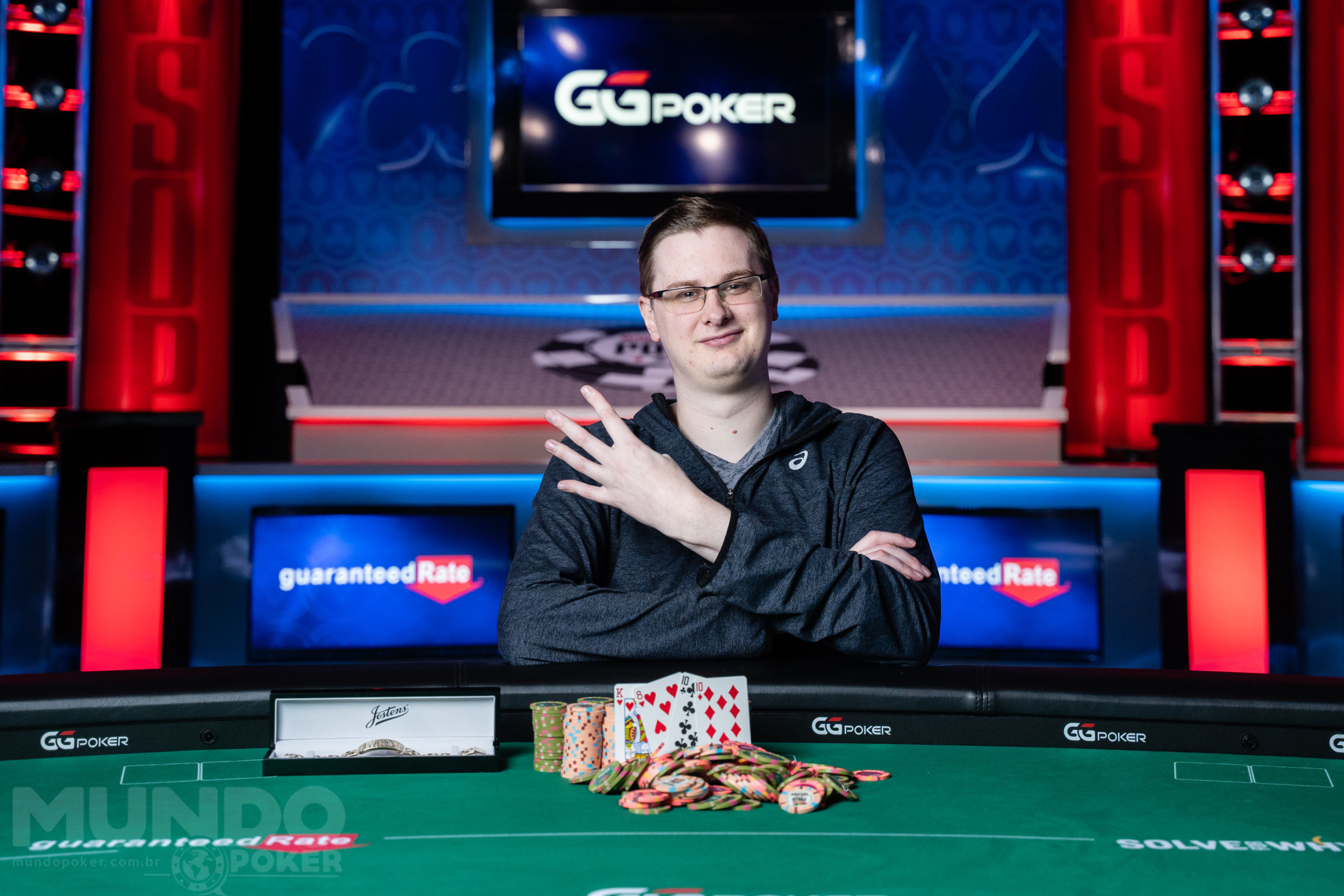 Para deixar tudo ainda mais especial, o jogador quebrou um par de reis na mão final. A ação começou no flop e terminou em all in, com Marius segurando contra . O lituano encontrou uma trinca no turn e confirmou o título após o river .