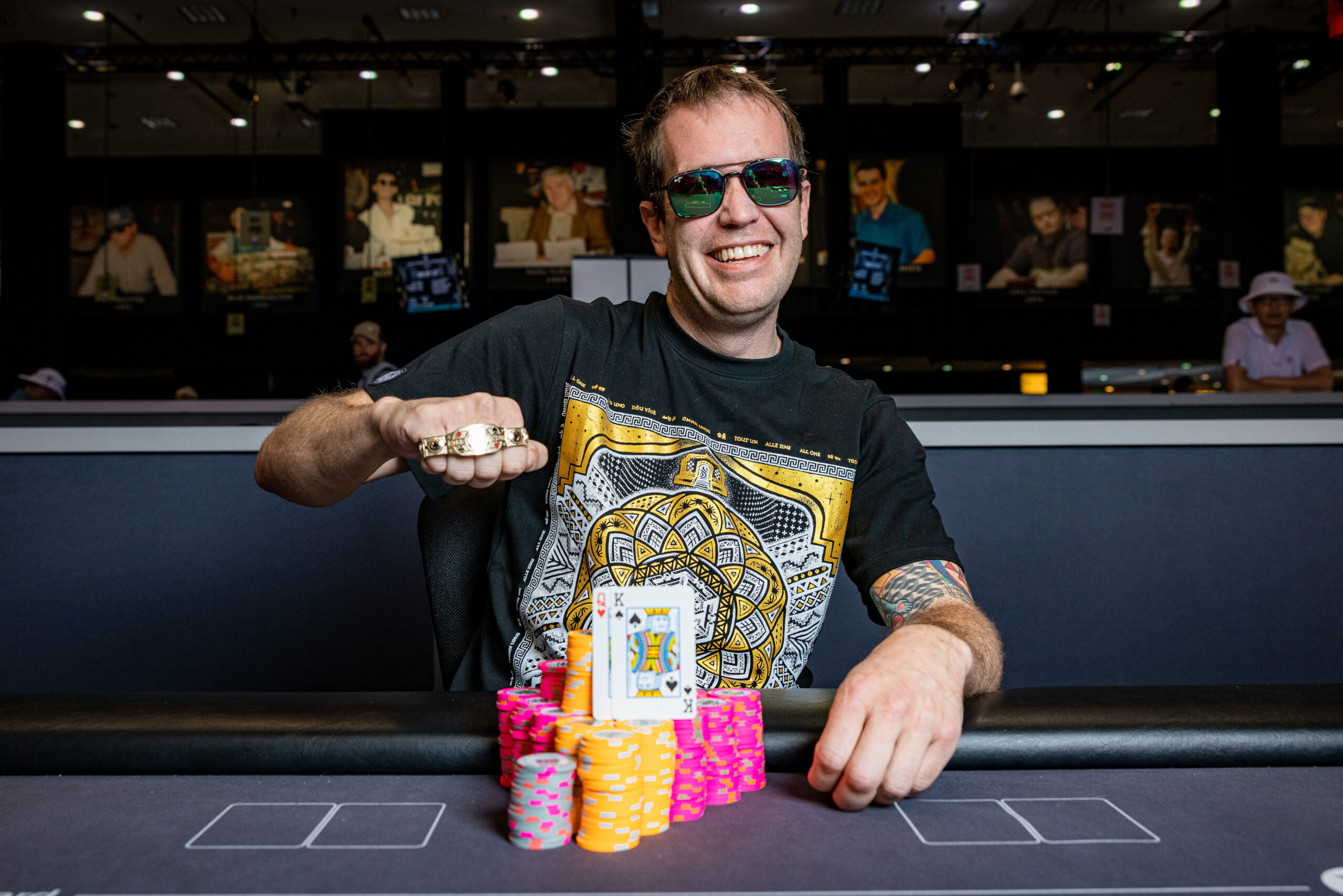 Para deixar tudo ainda mais especial, o jogador quebrou um par de reis na mão final. A ação começou no flop e terminou em all in, com Marius segurando contra . O lituano encontrou uma trinca no turn e confirmou o título após o river .