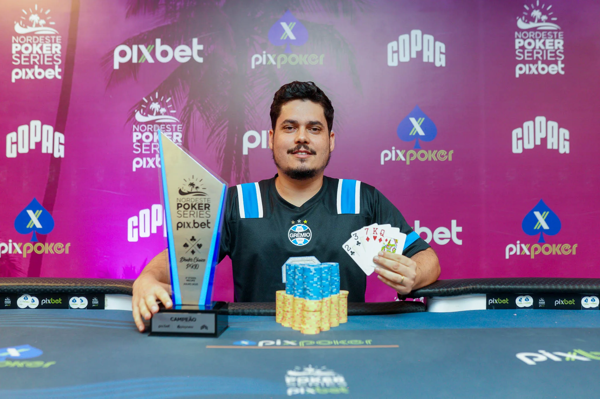 Em desvantagem, Gabriel buscou a virada. O desfecho veio em uma reviravolta no heads-up: “Ele começou o HU com umas 720 mil fichas contra minhas 140 mil. E aí eu consegui virar. Foi uma virada muito legal. Não era pra eu estar aqui, mas é isso… mais um troféu pra criançada de casa!”, completou.