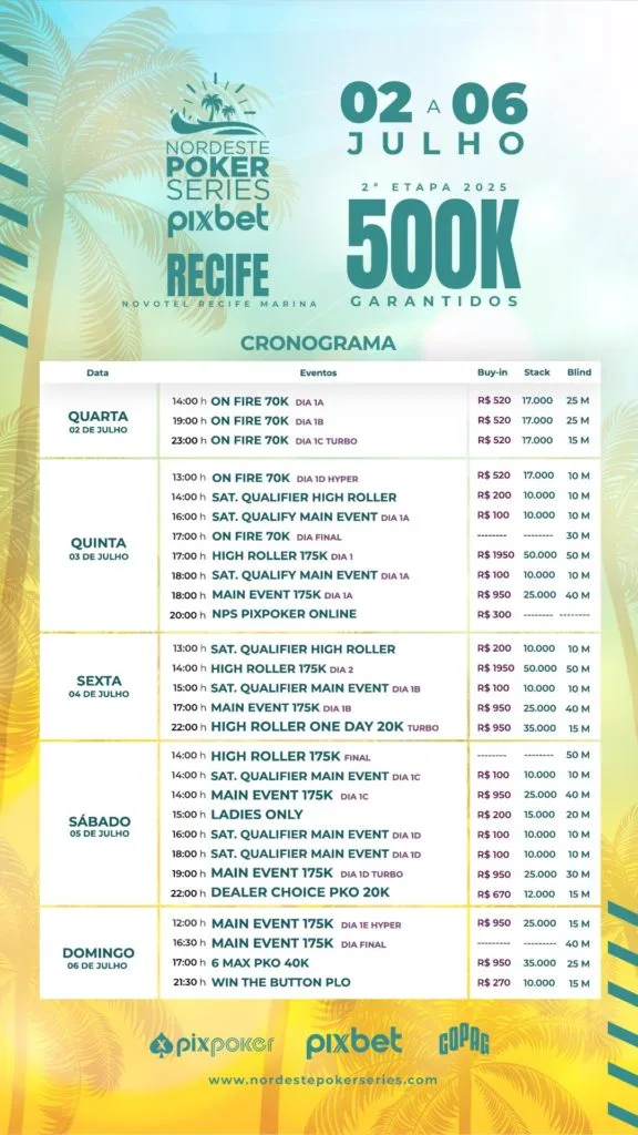 Ladies Only, PLO5 Dealer Choice Super Power e Dealer Choice PLO 5/6 também são atrações ao longo dos cinco dias de evento. O Mundo Poker estará presente em Recife trazendo todas as informações do NPS Pixbet. Não perca a cobertura completa!