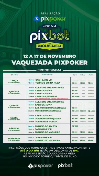 A diversão não para por aí! Durante toda a semana, as Olimpíadas PixPoker terão torneios emocionantes e muito cash games para você aproveitar ao máximo, no meio da melhor vaquejada do Brasil. Entre as outras atrações, se incluem torneios de Chute ao Gol para os mais habilidosos no futebol, Torneio de Roleta para os amantes dos cassinos e um “Show do Milhão” que vai testar conhecimentos.