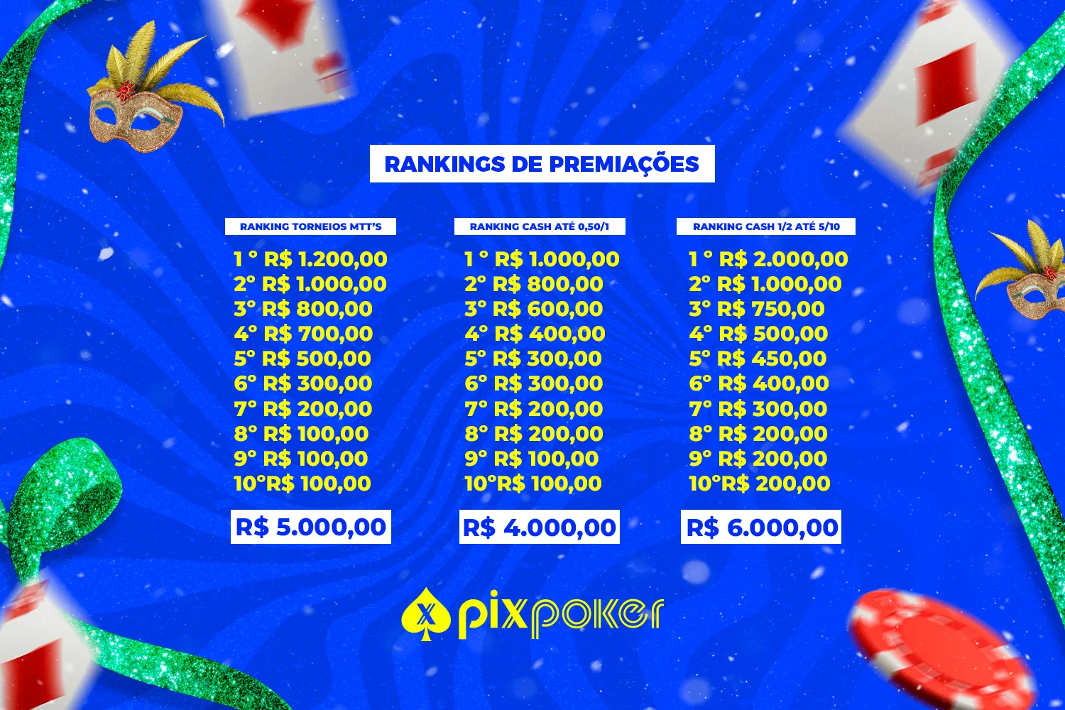 Com muitos torneios especiais na grade e com três rankings diferentes a serem disputados, o PixPoker Folia vai permitir que os jogadores entrem no clima de festa tendo a chance de sair com prêmios extras no final dessa série. Atualizados diariamente, os rankings vão pagar R$ 15.000 para os melhores jogadores.