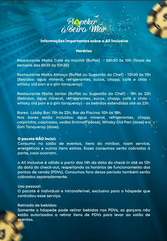 Quem adquiriu os pacotes completos poderá aproveitar todos os benefícios do “All Inclusive” do Wish Resort. Para esclarecer dúvidas sobre comidas e bebidas, a organização do PixPoker à Beira Mar preparou um guia detalhado explicando como funcionará o serviço no dia a dia do evento.