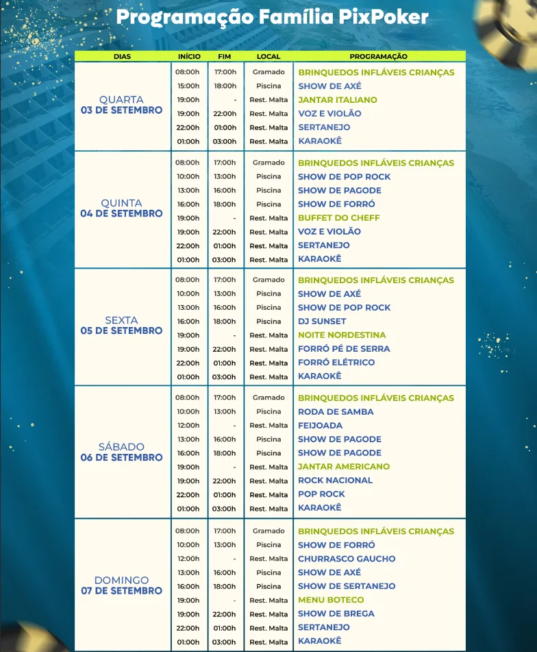 Além de muita emoção nas mesas, a festa do PixPoker à Beira Mar terá uma programação completa para toda a família presente no resort. As atividades começarão cedo, às 8h, com brinquedos e entretenimento para as crianças, seguidas de shows musicais e almoços e jantares especiais ao longo do dia.